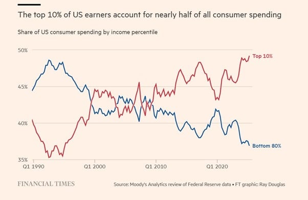 Un gráfico proveniente del Financial Times se ha viralizado en el Twitter de Estados Unidos por su impactante significado. La infografía muestra cómo hoy el top 10% de personas más ricas de Estados Unidos es responsable de casi la mitad de todo el gasto o consumo del país.