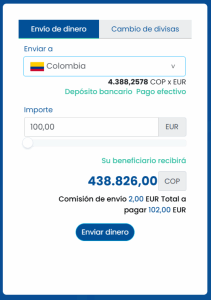 Por enviar el equivalente a 100 euros en pesos colombianos, Money Exchange te cobrará sólo dos euros de comisión. Esta plataforma, que trabaja con licencia del Banco de España, acepta transferencias bancarias, pagos con tarjeta o Bizum para enviar dinero de manera 100% online a cuentas radicadas en Colombia.