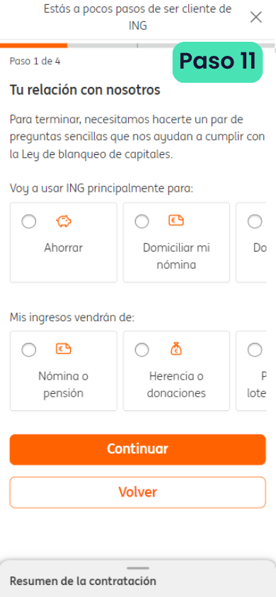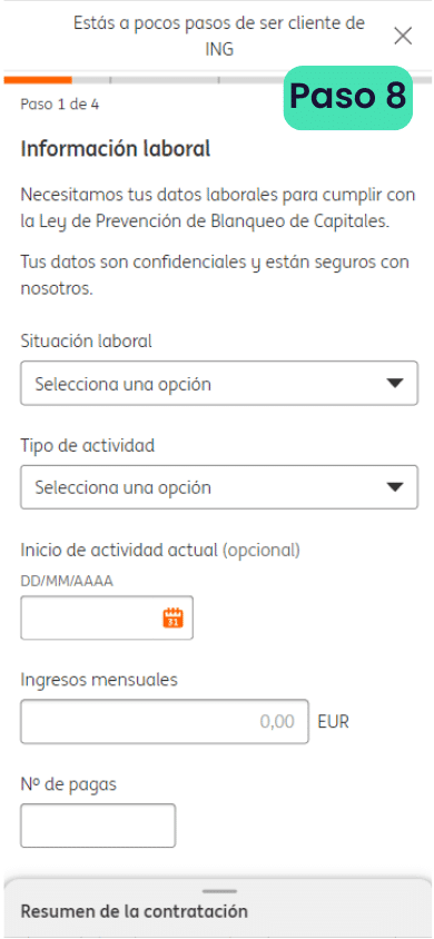 En uno de los pasos previos a abrir la cuenta corriente donde se deposita tu sueldo a final de mes se solicitan algunos datos financieros; entre ellos los ingresos mensuales. En este punto debes recordar que uno de los requisitos que se piden para abrir una cuenta en ING es o bien domiciliar ese salario que recibes, o bien aportar un pago de al menos 700 euros.