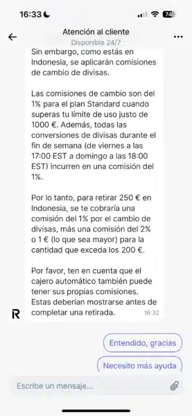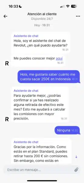 Por ahora, la verdad es que han sido muy eficientes. A continuación, verás un ejemplo de una pregunta realizada al chat de Revolut y la rapidez en la que la resolvieron: